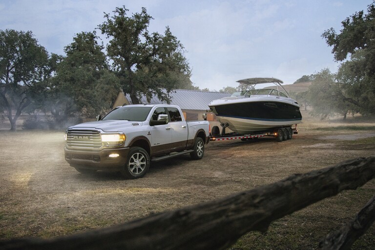 The Ram 2500 has two engine options for customers to consider. The standard 6.4-liter V8 engine produces 410 horsepower and 429 pound-feet of torque. An available 6.7-liter turbocharged six-cylinder diesel engine produces 370 horsepower and 850 pound-feet of torque. The Ram 2500 has a maximum towing capacity of 19,980 pounds and a maximum available payload of 4,000 pounds.