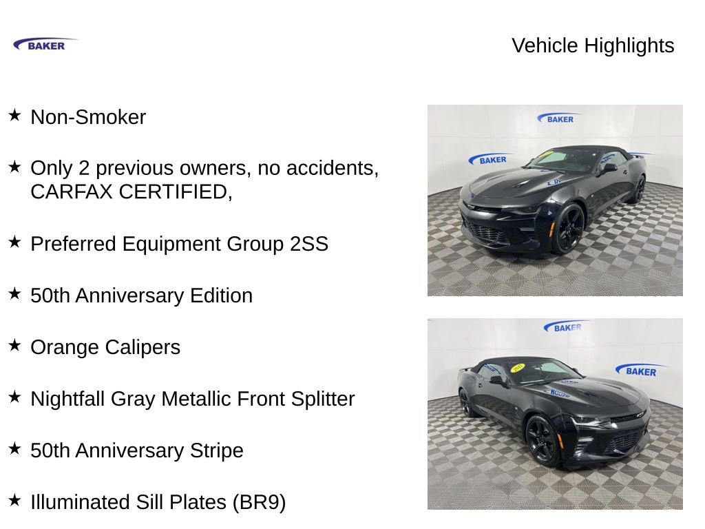 New Price! Mosaic Black Metallic 2017 Chevrolet Camaro SS 2SS RWD 8-Speed Automatic 6.2L V8 Non-Smoker, Only 2 previous owners, no accidents, CARFAX CERTIFIED,, Camaro SS 2SS, 2D Convertible, 6.2L V8, 8-Speed Automatic, RWD, Jet Black Leather, 50th Anniversary Edition, 50th Anniversary Stripe, Illuminated Sill Plates (BR9), Nightfall Gray Metallic Front Splitter, Orange Calipers, Preferred Equipment Group 2SS, Wheels: 20 x 8.5 Fr & 20 x 9.5 Rr 50th Anniv.