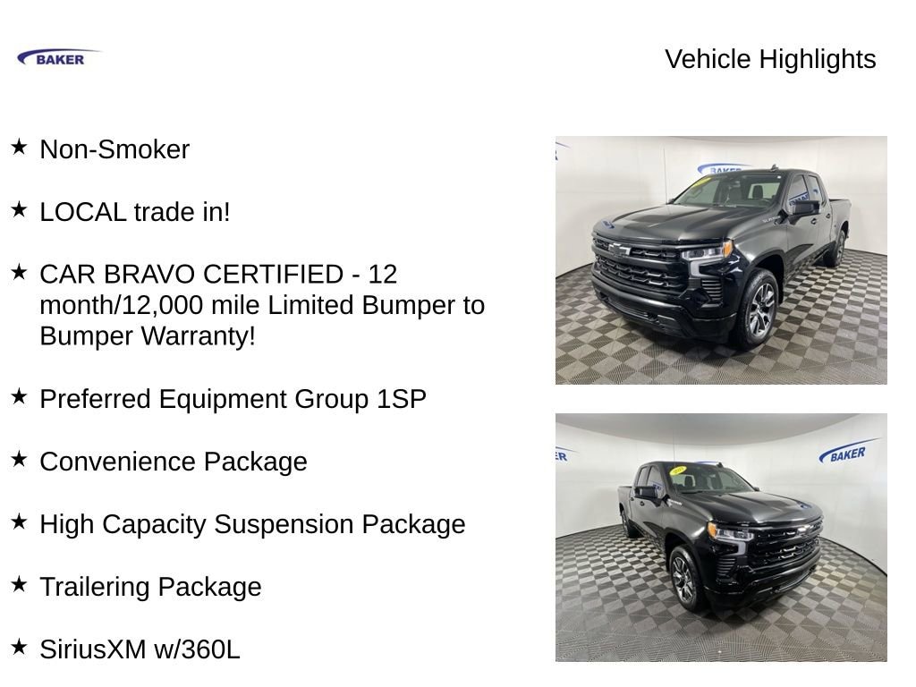 New Price! Black 2022 Chevrolet Silverado 1500 RST 4WD 8-Speed Automatic 2.7L Turbo Non-Smoker, LOCAL trade in!, CAR BRAVO CERTIFIED - 12 month/12,000 mile Limited Bumper to Bumper Warranty!, Silverado 1500 RST, 4WD, 10-Way Power Driver Seat w/Lumbar, 12.3 Multicolor Reconfigurable Digital Display, 120-Volt Instrument Panel Power Outlet, 6-Speaker Audio System, All-Star Edition, Auto-Locking Rear Differential, Bluetooth® For Phone, Color-Keyed Carpeting Floor Covering, Compass, Convenience Package, Deep-Tinted Glass, Dual Rear USB Ports (Charge Only), Dual-Zone Automatic Climate Control, Electric Rear-Window Defogger, Electrical Steering Column Lock, Electronic Cruise Control, EZ Lift Power Lock & Release Tailgate, Front Frame-Mounted Recovery Hooks, Front LED Fog Lamps, Front Rubberized Vinyl Floor Mats, HD Rear Vision Camera, Heated Driver & Front Outboard Passenger Seats, Heated Power-Adjustable Outside Mirrors, Heated Steering Wheel, High Capacity Suspension Package, High Gloss Black Mirror Caps, Inside Rear-View Mirror w/Tilt, Keyless Open & Start, Leather Wrapped Steering Wheel, LED Cargo Area Lighting, Manual Tilt/Telescoping Steering Column, OnStar & Chevrolet Connected Services Capable, Power Front Windows w/Driver Express Up/Down, Power Front Windows w/Passenger Express Down, Power Rear Windows w/Express Down, Preferred Equipment Group 1SP, Rear 60/40 Folding Bench Seat (Folds Up), Rear Rubberized-Vinyl Floor Mats, Remote Vehicle Starter System, SiriusXM w/360L, Standard Tailgate, Steering Wheel Audio Controls, Theft Deterrent System (Unauthorized Entry), Trailering Package, Wireless Phone Projection.