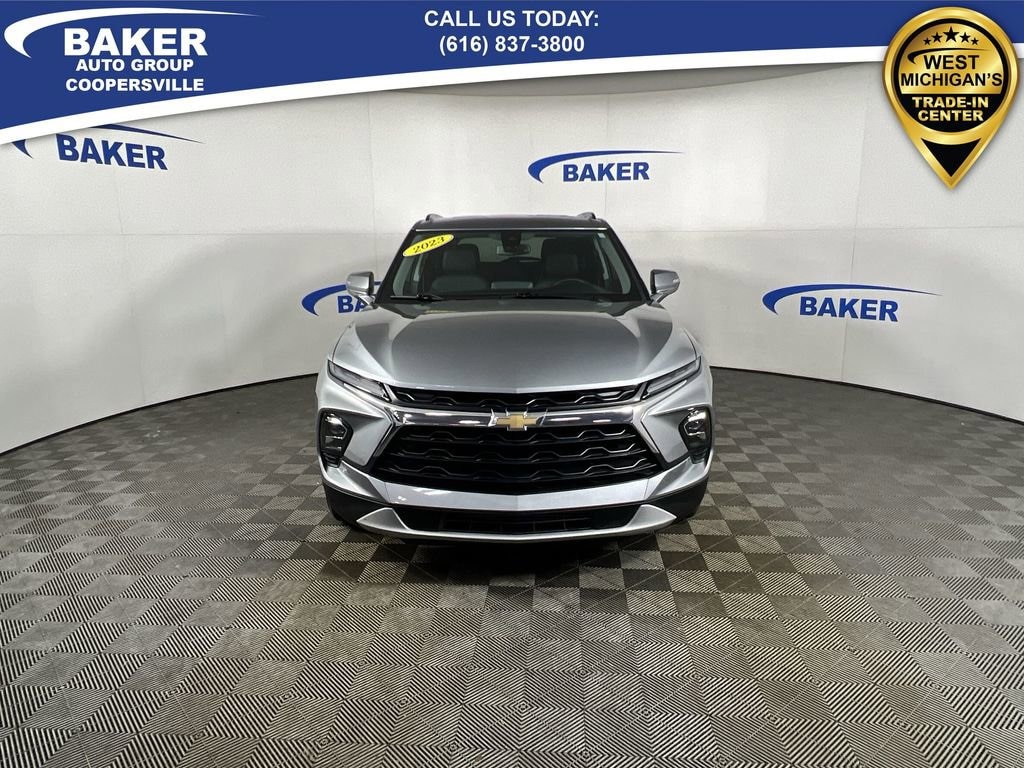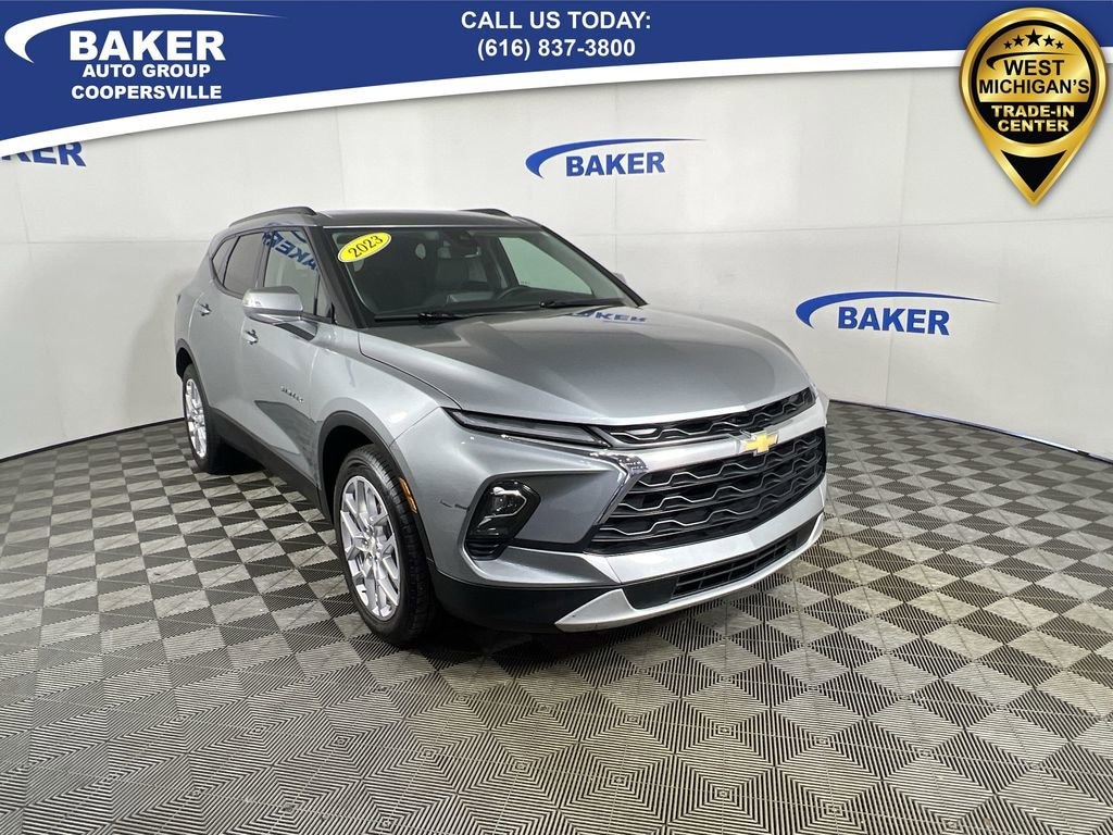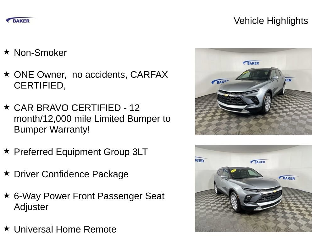New Price! Sterling Metallic 2023 Chevrolet Blazer LT AWD 9-Speed Automatic with Overdrive 2.0L Turbocharged Non-Smoker, ONE Owner, no accidents, CARFAX CERTIFIED,, CAR BRAVO CERTIFIED - 12 month/12,000 mile Limited Bumper to Bumper Warranty!, Blazer LT, 4D Sport Utility, 2.0L Turbocharged, 9-Speed Automatic with Overdrive, AWD, Sterling Metallic, Jet Black Leather, 6-Way Power Front Passenger Seat Adjuster, Black Roof-Mounted Side Rails, Driver Confidence Package, Heated Driver & Front Passenger Seats, Inside Rear-View Auto-Dimming Mirror, Lane Change Alert w/Side Blind Zone Alert, Outside Heated Power-Adjustable Body-Color Mirrors, Power Liftgate, Preferred Equipment Group 3LT, Rear Cross Traffic Alert, Rear Park Assist w/Audible Warning, Rear Power Programmable Liftgate, Universal Home Remote, Wheels: 20 Bright Silver Aluminum.