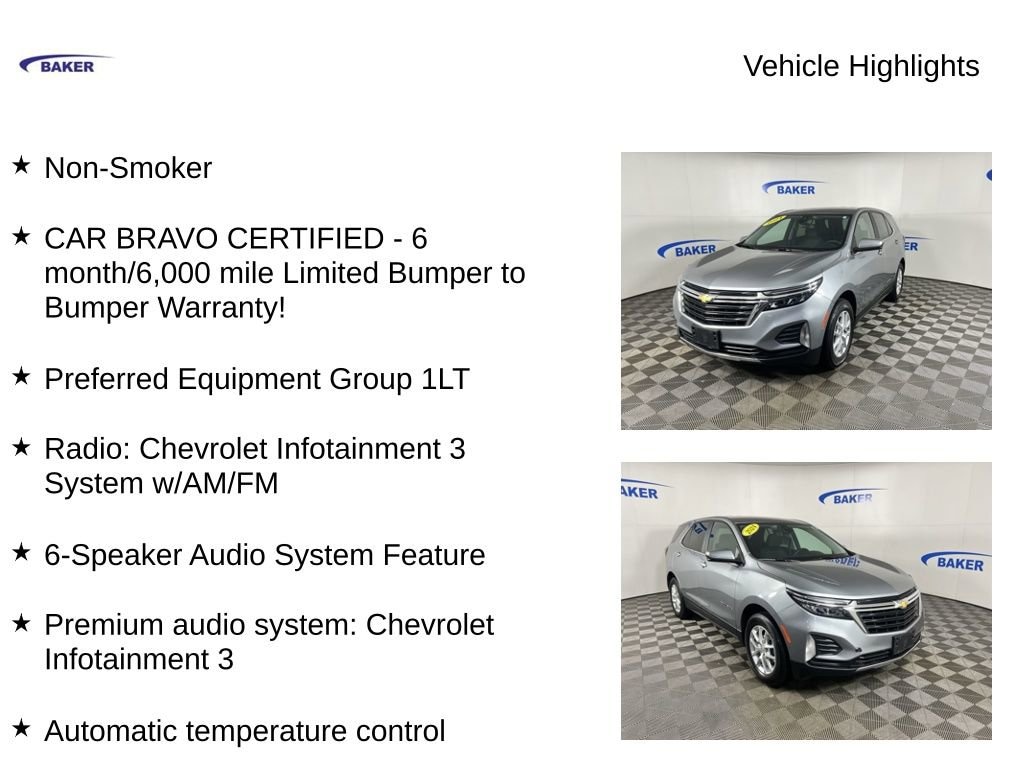New Price! Sterling Gray Metallic 2024 Chevrolet Equinox LT AWD 6-Speed Automatic Electronic with Overdrive 1.5L DOHC Non-Smoker, CAR BRAVO CERTIFIED - 6 month/6,000 mile Limited Bumper to Bumper Warranty!, Equinox LT, 1.5L DOHC, 6-Speed Automatic Electronic with Overdrive, AWD, Sterling Gray Metallic, Jet Black Cloth, 17 Aluminum Wheels, 2 Rear USB Charging-Only Ports, 2 USB Ports & Auxiliary Input Jack, 2-Way Power Driver Lumbar Control Seat Adjuster, 6-Speaker Audio System Feature, Air Conditioning, Automatic temperature control, Bluetooth® For Phone, Driver 8-Way Power Seat Adjuster, Front dual zone A/C, Front Passenger 4-Way Manual Seat Adjuster, Heated front seats, Power driver seat, Power Liftgate, Preferred Equipment Group 1LT, Premium audio system: Chevrolet Infotainment 3, Radio: Chevrolet Infotainment 3 System w/AM/FM.