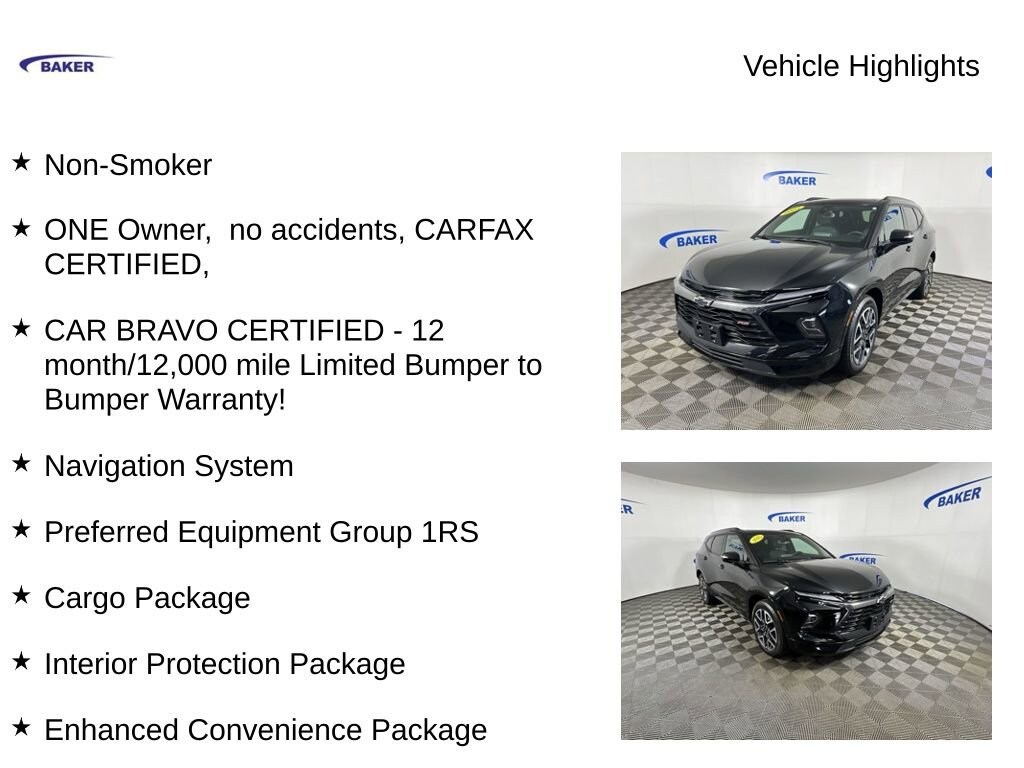 Black 2025 Chevrolet Blazer RS AWD 9-Speed Automatic with Overdrive 3.6L V6 SIDI Non-Smoker, ONE Owner, no accidents, CARFAX CERTIFIED,, CAR BRAVO CERTIFIED - 12 month/12,000 mile Limited Bumper to Bumper Warranty!, Blazer RS, 4D Sport Utility, 3.6L V6 SIDI, 9-Speed Automatic with Overdrive, AWD, Black, Jet Black With Red Accents Leather, Cargo Package, Enhanced Convenience Package, Heated Rear Outboard Seating Positions, Interior Protection Package, Memory Settings For Driver Seat and Exterior Mirrors, Navigation System, Power Liftgate, Power Panoramic Tilt-Sliding Sunroof, Power Tilt and Telescoping Steering Column, Preferred Equipment Group 1RS, Premium All-Weather Cargo Mat, Premium All-Weather Floor Mats, Retractable Cargo Shade, Ventilated Driver and Front Passenger Seats, Vertical Cargo Net, Wheels: : 20 Technical Gray Aluminum.