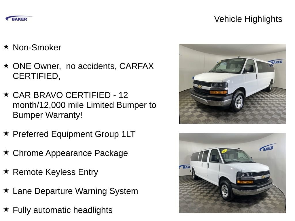 New Price! Summit White 2025 Chevrolet Express 3500 LT Passenger RWD Automatic with Overdrive 6.6L V8 Non-Smoker, ONE Owner, no accidents, CARFAX CERTIFIED,, CAR BRAVO CERTIFIED - 12 month/12,000 mile Limited Bumper to Bumper Warranty!, Express 3500 LT Passenger, Extended Passenger Van, 6.6L V8, Summit White, 12-Passenger Seating (2-3-3-4 Seating Config), 3rd row seats: bench, 4th-Row Bench Seat, Chrome Appearance Package, Deluxe Console w/Swing Out Storage Bin, Forward Collision Alert, Front Bucket Seats, Full-Floor Color-Keyed Carpeting, Fully automatic headlights, Lane Departure Warning System, Preferred Equipment Group 1LT, Reclining Front Bucket Seats w/Inboard Armrests, Remote Keyless Entry, Theft Alarm Notification, Wheel Trim w/Chrome Center Caps.