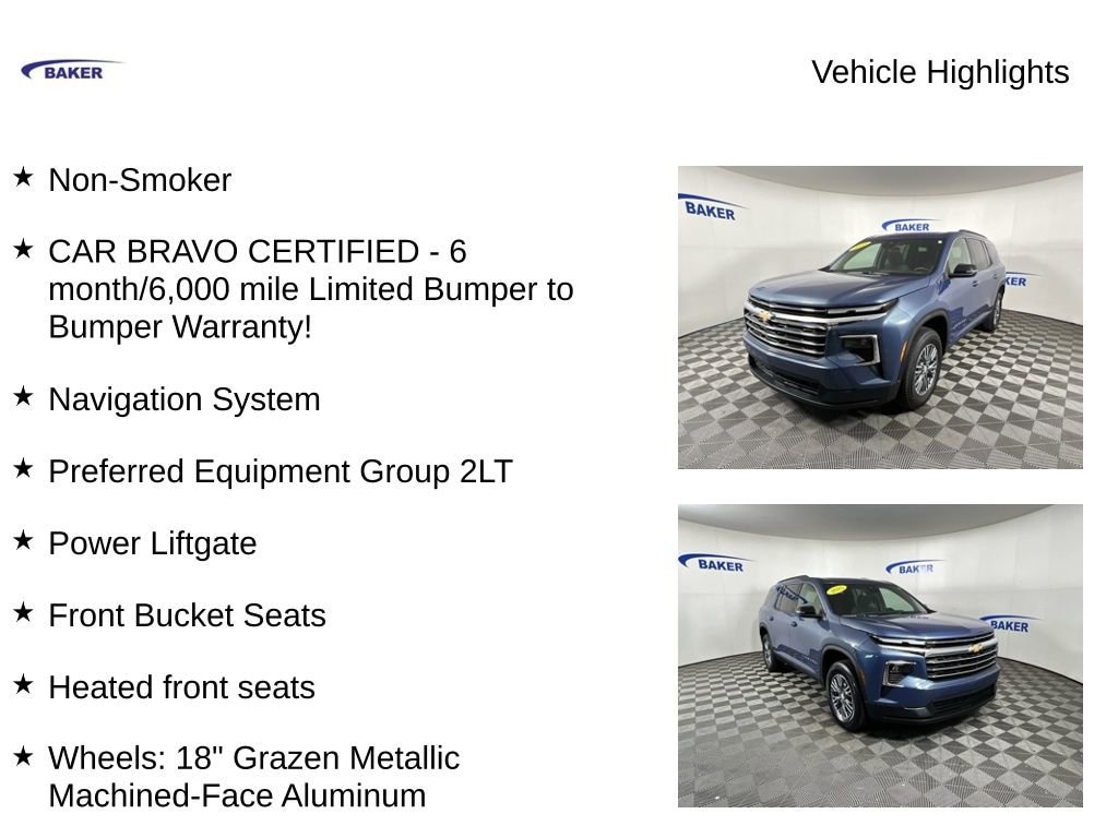 New Price! Lakeshore Blue Metallic 2025 Chevrolet Traverse LT 2LT AWD 8-Speed Automatic 2.5L DOHC Non-Smoker, CAR BRAVO CERTIFIED - 6 month/6,000 mile Limited Bumper to Bumper Warranty!, Traverse LT 2LT, 4D Sport Utility, 2.5L DOHC, 8-Speed Automatic, AWD, Lakeshore Blue Metallic, Front Bucket Seats, Heated front seats, Navigation System, Power Liftgate, Preferred Equipment Group 2LT, Wheels: 18 Grazen Metallic Machined-Face Aluminum.