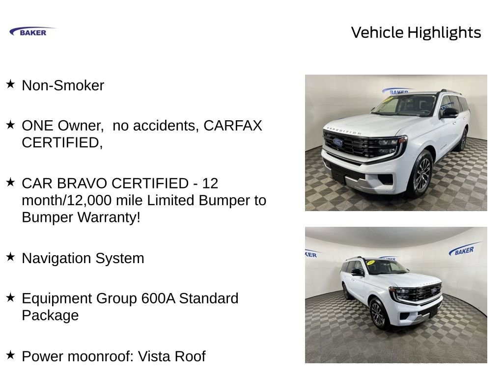 New Price! Certified. Space Silver Metallic 2025 Ford Expedition Platinum 4WD 10-Speed Automatic EcoBoost 3.5L V6 GTDi DOHC 24V Twin Turbocharged Non-Smoker, ONE Owner, no accidents, CARFAX CERTIFIED,, CAR BRAVO CERTIFIED - 12 month/12,000 mile Limited Bumper to Bumper Warranty!, Expedition Platinum, 4D Sport Utility, EcoBoost 3.5L V6 GTDi DOHC 24V Twin Turbocharged, 4WD, Space Silver Metallic, Black Onyx Leather, 2nd Row Power-Folding Captain's Chairs, Equipment Group 600A Standard Package, Navigation System, Power moonroof: Vista Roof, Wheels: 20 Ebony Bright Machined Aluminum.