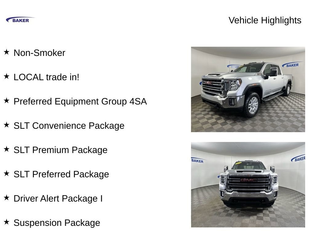 New Price! Quicksilver Metallic 2021 GMC Sierra 2500HD SLT 4WD 10-Speed Automatic Duramax 6.6L V8 Turbodiesel Non-Smoker, LOCAL trade in!, Sierra 2500HD SLT, Duramax 6.6L V8 Turbodiesel, 10-Speed Automatic, 4WD, Quicksilver Metallic, 10-Way Power Driver Seat Adjuster w/Lumbar, 10-Way Power Passenger Seat Adjuster w/Lumbar, 12-Volt Rear Auxiliary Power Outlet, 120-Volt Bed Mounted Power Outlet, 120-Volt Instrument Panel Power Outlet, 2 USB Ports, 2 USB Ports (1st Row), 2-Speed Active Transfer Case, 20 Machined Aluminum Wheels, 220 Amps Alternator, 2nd Row Dual USB Charge-Only Ports, 4.2 Diagonal Color Display Driver Info Center, 6 Rectangular Chromed Tubular Assist Steps, Apple CarPlay/Android Auto, Bed View Camera w/2 Trailer Camera Provisions, Bose Premium 7 Speaker Sound System, Chrome Surround Grille w/High Gloss Black Mesh, Deep-Tinted Glass, Driver Alert Package I, Driver Memory, Electric Rear-Window Defogger, Floor-Mounted Center Console, Front Bucket Seats, HD Surround Vision, Heated & Ventilated Front Bucket Seats, Heated 2nd Row Outboard Seats, Heated Driver & Front Outboard Passenger Seats, Heated front seats, Hitch Guidance w/Hitch View, In-Vehicle Trailering System App, Integrated Trailer Brake Controller, Lane Change Alert w/Side Blind Zone Alert, LED Cargo Area Lighting, LED Smoked Amber Roof Marker Lamps, Memory seat, Perimeter Lighting, Power Door Locks, Power driver seat, Power Front Passenger Windows w/Express Up/Down, Power passenger seat, Power Rear Windows w/Express Down, Power Sliding Rear Window w/Defogger, Preferred Equipment Group 4SA, Radio: Premium GMC Infotainment Sys w/Navigation, Rear Cross Traffic Alert, Rear Wheelhouse Liners, Remote Vehicle Starter System, SLT Convenience Package, SLT Preferred Package, SLT Premium Package, Spray-On Pickup Box Bed Liner w/GMC Logo, Suspension Package, Trailer Tire Pressure Monitor Sensors, Ultrasonic Front & Rear Park Assist, Unauthorized Entry Theft-Deterrent System, Universal Home Remote, Wireless Charging, Wireless Phone Projection.CALL US TODAY 6168373800. Recent Arrival!