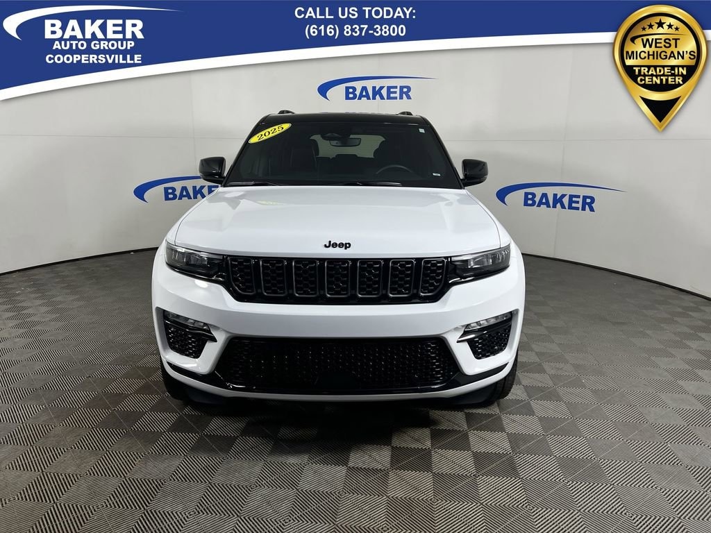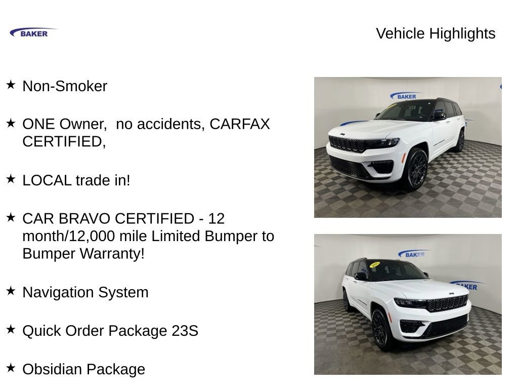 New Price! Bright White Clearcoat 2025 Jeep Grand Cherokee Summit 4WD 8-Speed Automatic 3.6L V6 24V VVT Non-Smoker, ONE Owner, no accidents, CARFAX CERTIFIED,, LOCAL trade in!, CAR BRAVO CERTIFIED - 12 month/12,000 mile Limited Bumper to Bumper Warranty!, Grand Cherokee Summit, 3.6L V6 24V VVT, 8-Speed Automatic, 4WD, Bright White Clearcoat, Global Black Leather, Front dual zone A/C, Gloss Black Exterior Accents, Heated front seats, Heated rear seats, Heated steering wheel, Memory seat, Navigation System, Neutral Gray Exterior Accents, Obsidian Package, Painted Door Cladding, Power driver seat, Power Liftgate, Power moonroof, Power passenger seat, Quick Order Package 23S, Radio: Uconnect 5 Nav with 10.1 Display, Rear dual zone A/C, Ventilated front seats, Wheels: 21 x 9 Black Painted Aluminum.