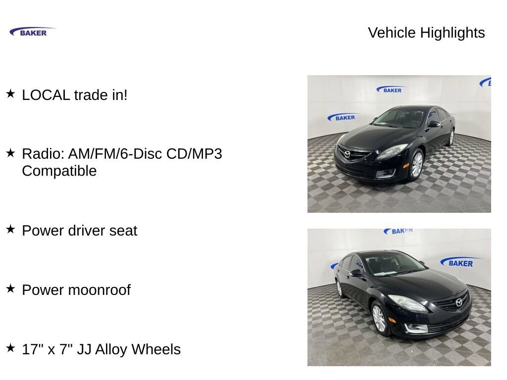 New Price! Ebony Black 2011 Mazda Mazda6 i Touring Plus FWD 5-Speed Automatic with Manual Mode 2.5L 4-Cylinder DOHC 16V Non-Smoker, LOCAL trade in!, Mazda6 i Touring Plus, 2.5L 4-Cylinder DOHC 16V, 5-Speed Automatic with Manual Mode, FWD, Ebony Black, Black Cloth, 17 x 7 JJ Alloy Wheels, Power driver seat, Power moonroof, Radio: AM/FM/6-Disc CD/MP3 Compatible.CALL US TODAY 6168373800. Recent Arrival! 22/31 City/Highway MPGReviews:* Roomy cabin; big trunk; muscular performance from V6; smooth automatic transmissions; sporty handling. Source: Edmunds