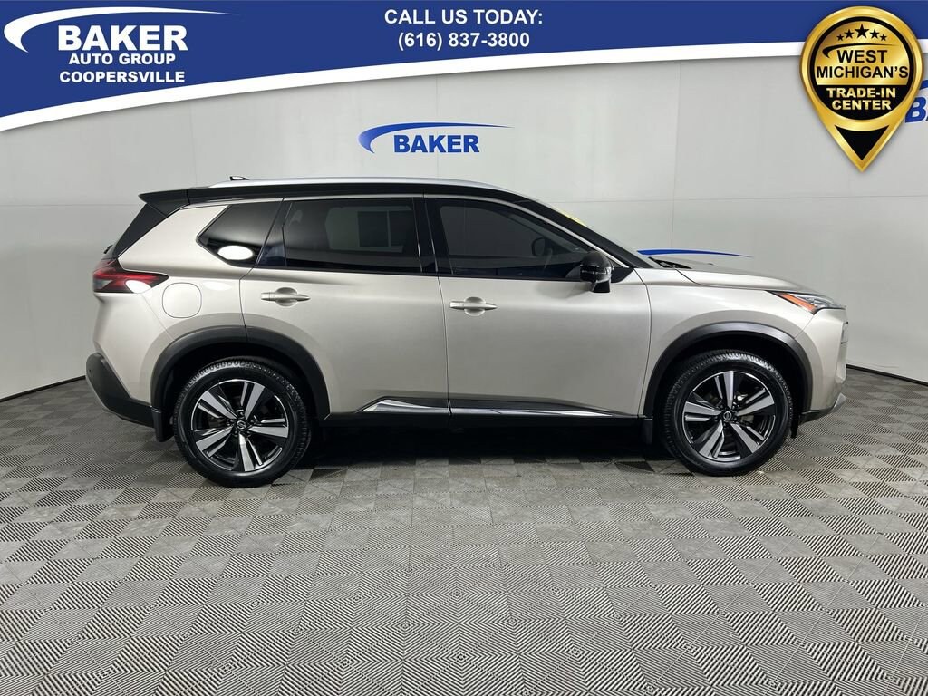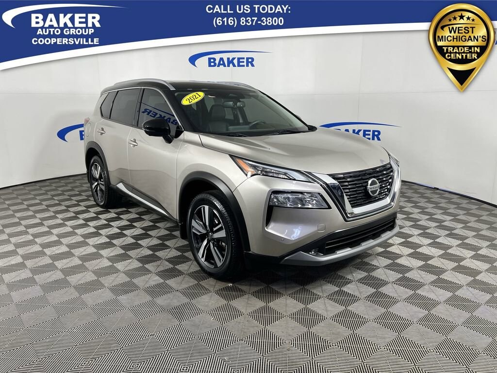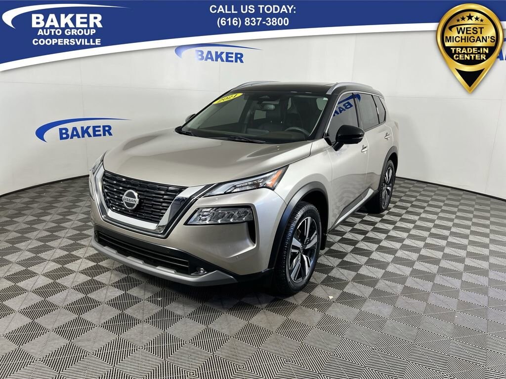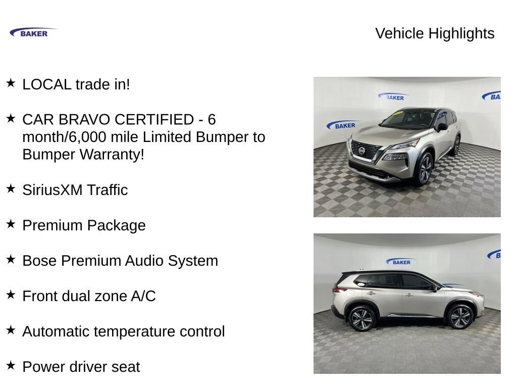 Champagne Silver Metallic/Super Black 2021 Nissan Rogue SL AWD CVT with Xtronic 2.5L I4 DOHC 16V LOCAL trade in!, CAR BRAVO CERTIFIED - 6 month/6,000 mile Limited Bumper to Bumper Warranty!, Rogue SL, 2.5L I4 DOHC 16V, CVT with Xtronic, AWD, 19 Aluminum Alloy Wheels, Automatic temperature control, Bose Premium Audio System, Chrome Rear Bumper Protector, Exterior Parking Camera Rear, First Aid Kit, Floor Mats w/2-Piece Cargo Area Protector, Front & Rear Sonar, Front dual zone A/C, Heated Front Bucket Seats, Heated steering wheel, Memory seat, Nissan Door To Door Navigation, NissanConnect featuring Apple CarPlay and Android Auto, Power driver seat, Power Liftgate, Power moonroof, Power passenger seat, Premium Package, ProPILOT Assist +, Rear Parking Sensors, SiriusXM Traffic.