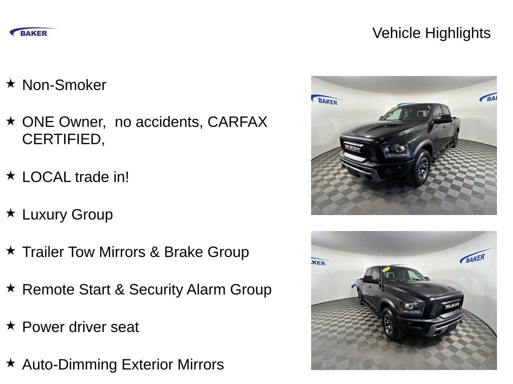 Brilliant Black Crystal Pearlcoat 2016 Ram 1500 Rebel 4WD 8-Speed Automatic HEMI 5.7L V8 Multi Displacement VVT Non-Smoker, ONE Owner, no accidents, CARFAX CERTIFIED,, LOCAL trade in!, 1500 Rebel, 4D Crew Cab, HEMI 5.7L V8 Multi Displacement VVT, 4WD, Brilliant Black Crystal Pearlcoat, Auto-Dimming Exterior Mirrors, Glove Box Lamp, Heated front seats, Heated steering wheel, LED Bed Lighting, Luxury Group, Overhead Console w/Garage Door Opener, Power Black Trailer Tow Mirrors, Power driver seat, Power Folding Mirrors, Power Heated Fold-Away Mirrors, Rear Dome w/On/Off Switch Lamp, Rear-View Auto-Dimming Mirror w/Microphone, Remote Start & Security Alarm Group, Trailer Brake Control, Trailer Tow Mirrors, Trailer Tow Mirrors & Brake Group, Underhood Lamp, Wheels: 17 x 8 Aluminum w/Matte Black Pocket.