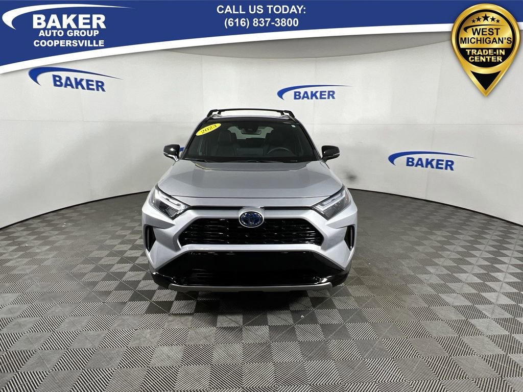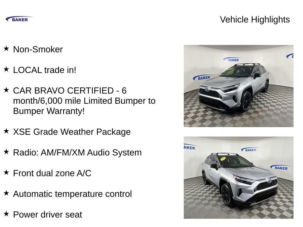 New Price! Silver Sky Metallic/Midnight Black Metallic 2023 Toyota RAV4 Hybrid XSE AWD eCVT 2.5L 4-Cylinder Non-Smoker, LOCAL trade in!, CAR BRAVO CERTIFIED - 6 month/6,000 mile Limited Bumper to Bumper Warranty!, RAV4 Hybrid XSE, 2.5L 4-Cylinder, eCVT, AWD, Silver Sky Metallic/Midnight Black Metallic, Black w/SofTex Seat Trim, Automatic temperature control, Front dual zone A/C, Heated 3-Spoke Leather Steering Wheel, Heated Front Seats, Lane Departure Warning System, Power driver seat, Power Liftgate, Power moonroof, Radio: AM/FM/XM Audio System, SofTex Seat Trim, Wheels: 18 x 7.0J Black-Painted Aluminum Alloy, XSE Grade Weather Package.