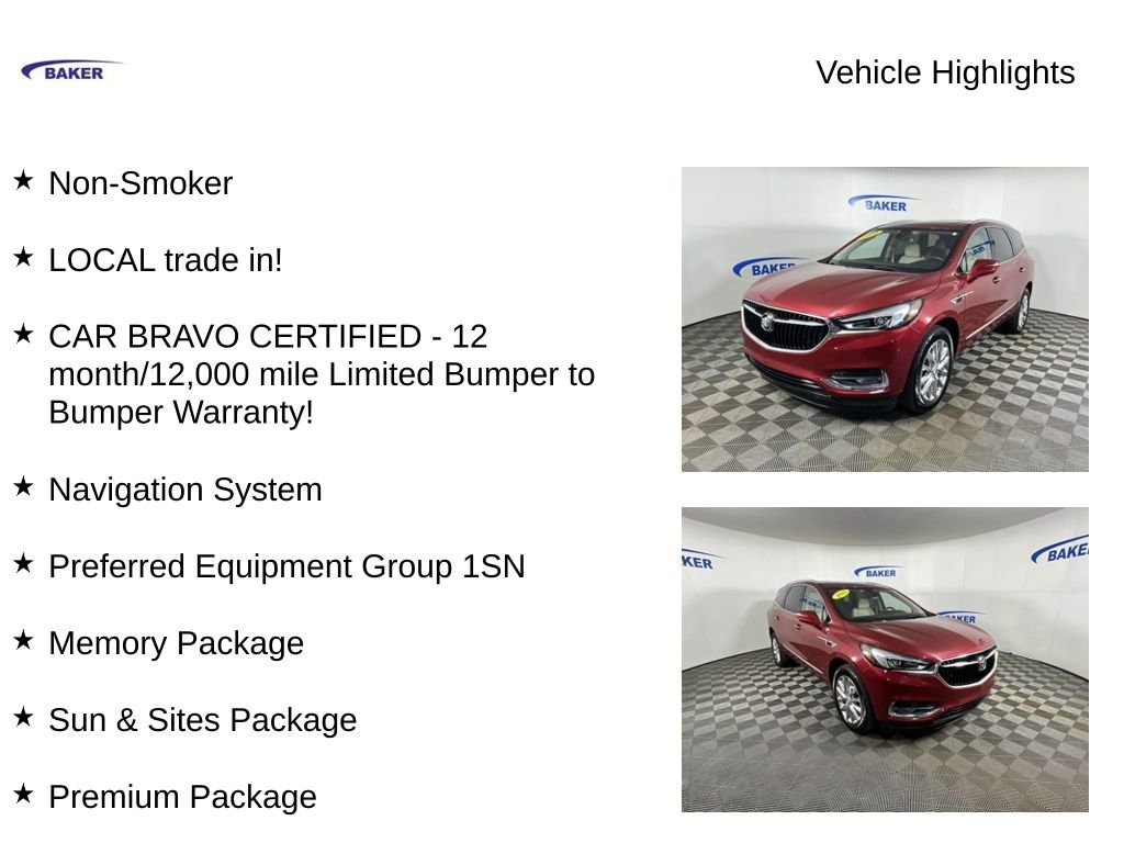 Red Quartz Tintcoat 2021 Buick Enclave Premium Group AWD 9-Speed Automatic 3.6L V6 SIDI VVT Non-Smoker, LOCAL trade in!, CAR BRAVO CERTIFIED - 12 month/12,000 mile Limited Bumper to Bumper Warranty!, Enclave Premium Group, 4D Sport Utility, 3.6L V6 SIDI VVT, AWD, Red Quartz Tintcoat, Shale With Ebony Interior Accents Leather, 20 Polished Aluminum Wheels, 5000lbs Trailering Package, Front Power Sliding Moonroof, Heavy-Duty Cooling System, Hitch Guidance, Hitch Guidance w/Hitch View, Memory Package, Navigation System, Preferred Equipment Group 1SN, Premium Package, Radio: Buick Infotainment Sys AM/FM Stereo w/Nav, Sun & Sites Package.