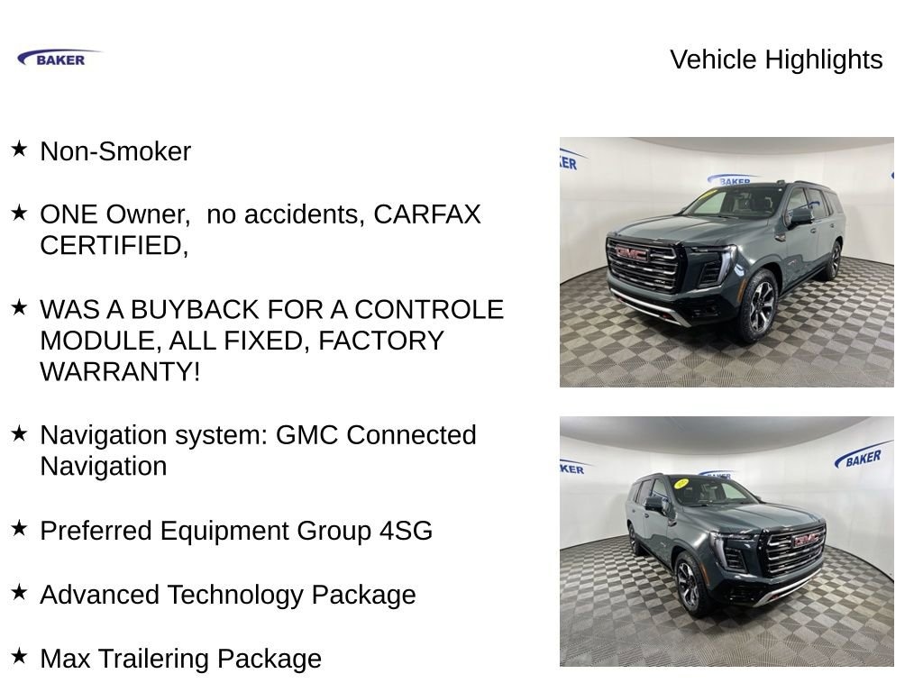 New Price! Midnight Pine 2025 GMC Yukon AT4 Ultimate 4WD 10-Speed Automatic with Overdrive 3.0L I6 Non-Smoker, ONE Owner, no accidents, CARFAX CERTIFIED,, WAS A BUYBACK FOR A CONTROLE MODULE, ALL FIXED, FACTORY WARRANTY!, Yukon AT4 Ultimate, 4D Sport Utility, 3.0L I6, 10-Speed Automatic with Overdrive, 4WD, Midnight Pine, Obsidian Rush With Red Accents Leather, 15 Diagonal Multi-Color Head-Up Display, 1st and 2nd Rows All-Weather Floor Liners, 3rd Row All-Weather Floor Liners, 4-Spoke Leather-Wrapped Steering Wheel, 4-Way Power Driver Lumbar Seat Adjuster, 4-Way Power Front Passenger Lumbar Seat Adjuster, 8 Diagonal Rear Touchscreen Climate Control, Advanced Security Package, Advanced Technology Package, All-Weather Cargo Mat, AutoSense Hands-Free Power Liftgate, Black Roof-Mounted Luggage Rack Side Rails, Body-Color Door Handles, Bose 18-Speaker Surround with Centerpoint, Bright Front and Rear Door Sill Plates, Driver 2-Way Power Upper Shoulder, Driver Power Massage Seat, Dual Exhaust System, Dual-Pane Panoramic Power Sunroof, Floor Liner Package, Front High-Approach Angle Fascia, Front Passenger 2-Way Power Upper Shoulder, Front Passenger Power Massage Seat, Glass Breakage Sensor, Heavy-Duty Air Filter, Hill Descent Control, Inside Rearview Auo-Dimming Rear Camera Mirror, Magnetic Ride Control Suspension, Max Trailering Package, Navigation system: GMC Connected Navigation, Night Vision, Perforated Heather and Ventilated Driver and Front Passenger Seats, Power Liftgate, Power Release 2nd Row Bucket Seats, Power Tilt and Telescopic Steering Column, Power-Retractable Assist Steps, Preferred Equipment Group 4SG, Premium Capability Package with Active Response 4WD, Rear Seat Media System, Red Horizontal-Mounted Recovery Hooks, Sport Pedal Cover Kit, Super Cruise, Theft-Deterrent Alarm System, Vehicle Inclination Sensor, Vehicle Interior Movement Sensor, Wheels: 20 x 9 Machined and Painted.